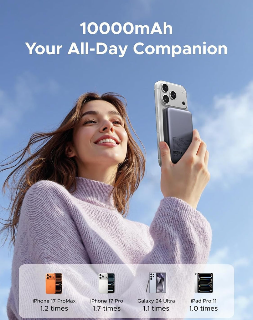 - Double Power for the Whole Day: Equipped with a 10,000 mAh high-density Li-polymer battery, this power bank can fully charge an iPhone 15 Pro about 1.8–1.9 times under normal conditions. Actual results may vary depending on device model, charging environment, and usage habits. Ideal for all-day calls, videos, and music.